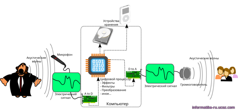Звук — это колебания среды (воздуха, воды). С помощью микрофона звук преобразуется в аналоговый электрический сигнал, который в любой момент времени может принимать любое значение в некотором интервале. Этот сигнал можно подать на вход звуковой карты, где специальное устройство — аналого-цифровой преобразователь (АЦП) — преобразует его в цифровой код. Процессор компьютера может затем обработать этот код по некоторому алгоритму, сохранить в файле и т. д. (рис. 2.27).