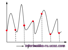 При оцифровке звука выполняется дискретизация — из всего бесконечного множества значений аналогового сигнала сохраняются в памяти только значения в отдельных точках, взятых с некоторым шагом Т по времени (рис. 2.28, а). Это называется дискретизацией по времени.