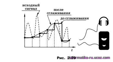 Простейший метод восстановления сигнала по отдельным отсчётам — построить ступенчатый сигнал (рис. 2.29). В современных звуковых картах для повышения качества звука этот ступенчатый сигнал сглаживается с помощью специальных фильтров, однако восстановить точно исходный сигнал всё равно не удаётся, так как информация о значениях сигнала между моментами дискретизации была потеряна при оцифровке.
